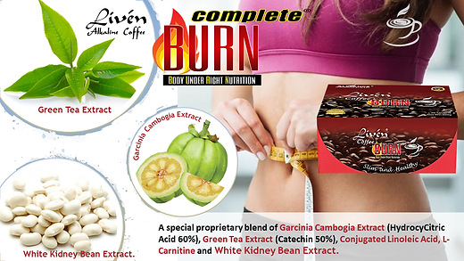 BURN LIVEN COFFEE Made of premium Arabica beans, fortified with Complete Phyto Energizer, Satiereal, Carnipure, Green Tea Extract, EFLA 942, Garcinia Cambogia & Anhydrous Caffeine, the infusion of these ingredients are formulated to increase metabolism, energy and the feeling of satiety that support weight loss management.