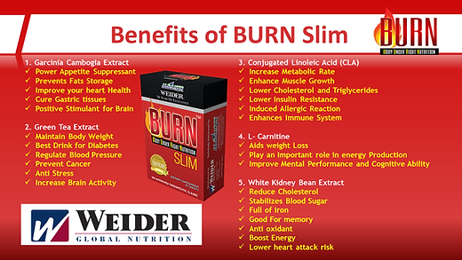 BURN SLIM TABLET A special proprietary blend of Garcinia Cambogia Extract (HydrocyCitric Acid 60%), Green Tea Extract (Catechin 50%), Conjugated Linoleic Acid, L-Carnitine and White Kidney Bean Extract.